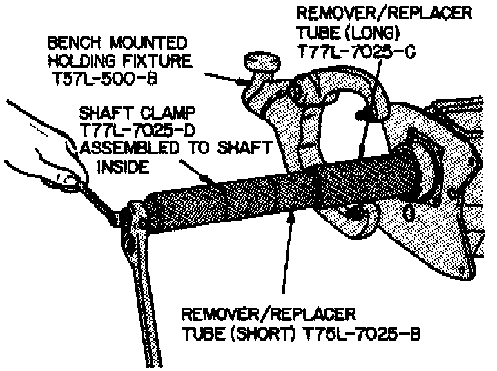 10. Position rear of output shaft and geartrain through rear bearing bore in case and tilt assembly until it can be installed in case.