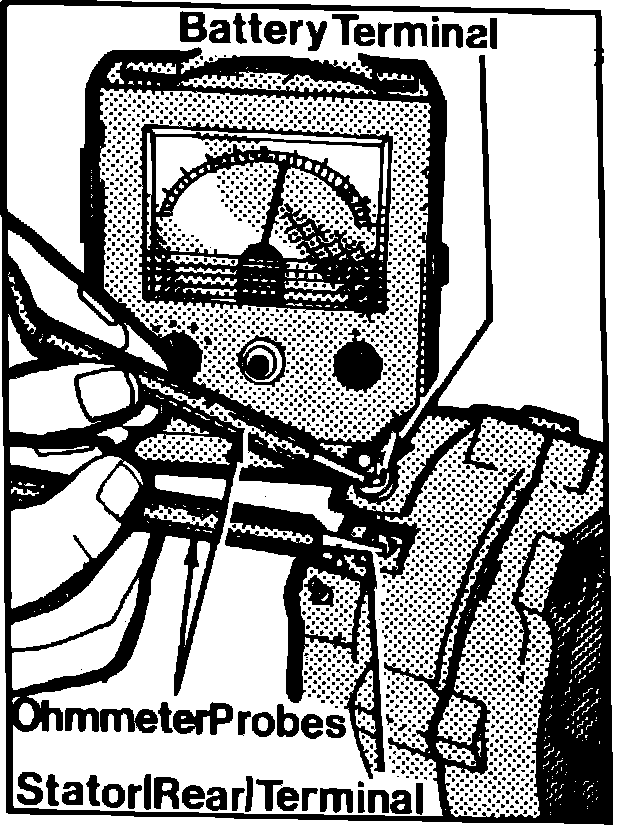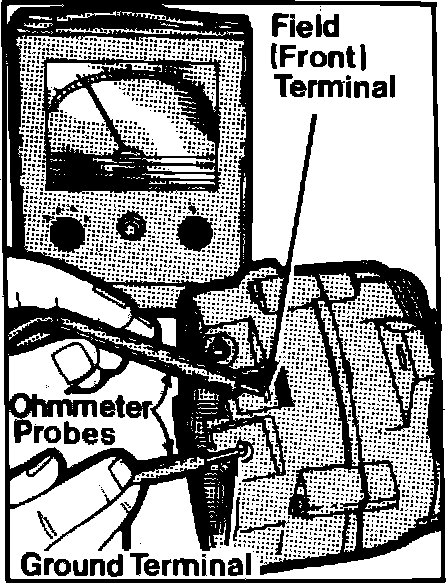 6. Connect alternator rear housing with one ohmmeter probe and touch the other probe to the regulator ``F'' terminal. Reverse probes and repeat test. Ohmmeter reading should be infinite in one probe direction and approximately 9 ohms in the other.