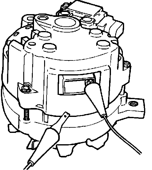 2. Spin the alternator pulley and note meter reading, then reverse probes and repeat step 1. In one probe direction ohmmeter reading should be between 2.2 and 100 ohms and may fluctuate while pulley is turning. In the other direction, reading should fluctuate between 2.2 and approximately 9 ohms.