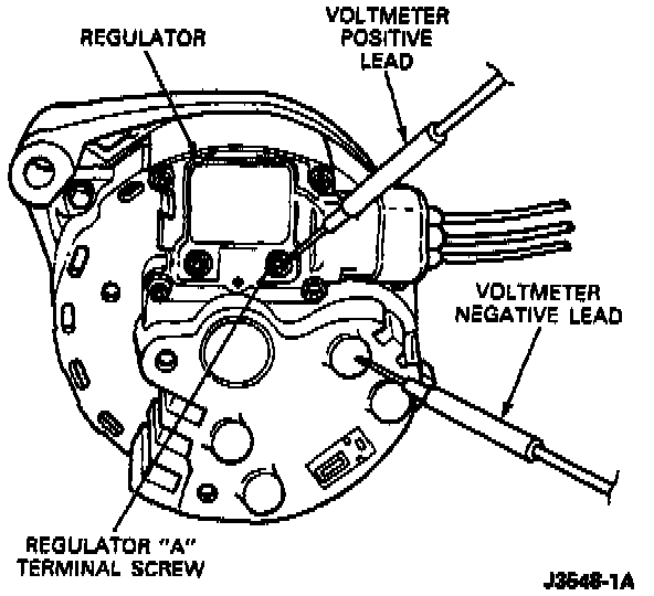 1. With the ignition in the run position (engine not running), connect the voltmeter negative lead to the alternator rear housing. Contact the voltmeter positive lead first to the alternator output connection at the starter solenoid and then to the regulator A screw head.