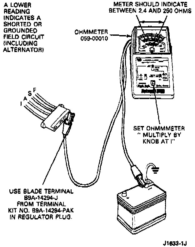 1. Disconnect wiring plug from regulator and connect an ohmmeter from the F terminal of the plug to a ground. The meter should read more than 2.4 ohms. If less than 2.4 ohms is indicated, service the grounded field circuit in the wiring harness or the alternator and then repeat the load test. Load Test