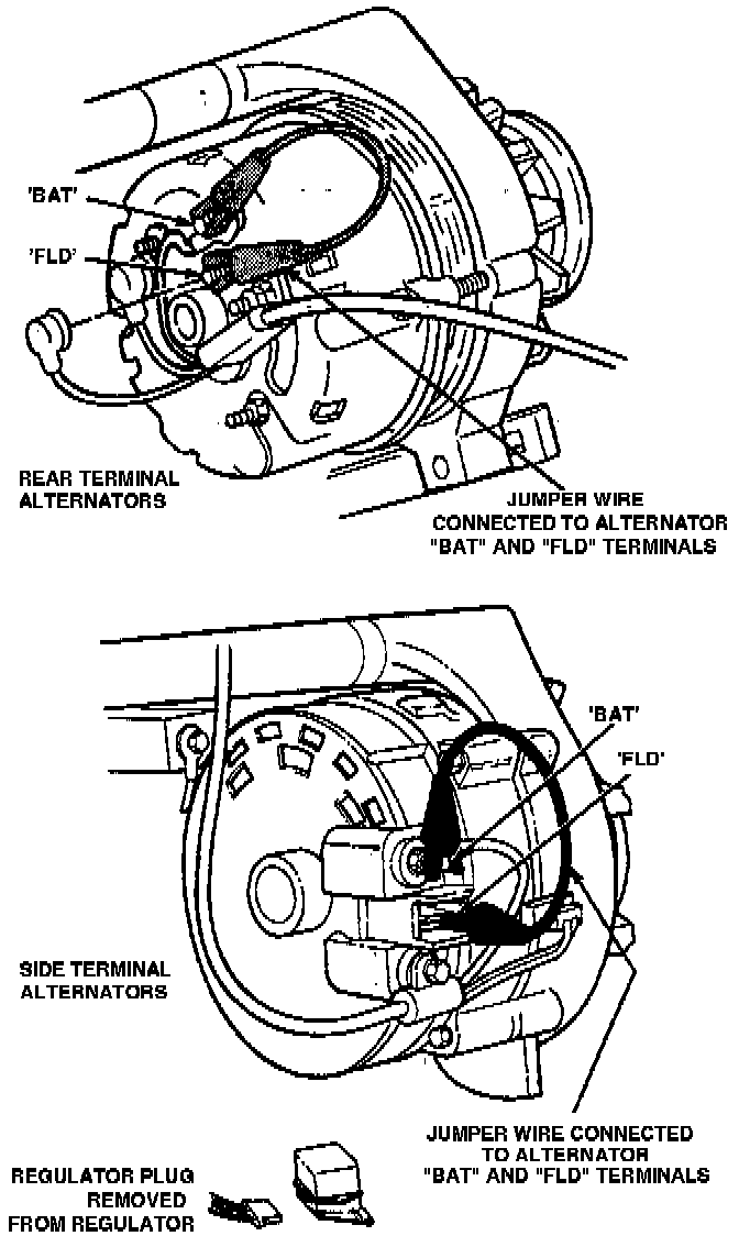 3. If the voltmeter still indicates a problem of under voltage, remove the jumper wire from the regulator plug and leave the plug disconnected from the regulator. Disconnect the FLD terminal on the alternator and pull back the protective cover from the BAT terminal. Then connect a jumper wire to the FLD and BAT terminals on the alternator and repeat the load test. Load Test