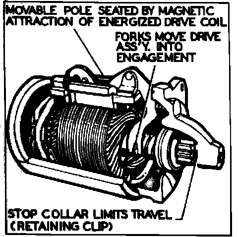 When the ignition switch is turned on to the start position, the starter relay is energized and supplies current to the motor. The current flows through one field coil and a set of contact points to ground. The magnetic field given off by the field coil pulls the movable pole, which is part of the lever, downward to its seat. When the pole is pulled down, the lever moves the drive assembly into the engine flywheel, Fig. 2.
