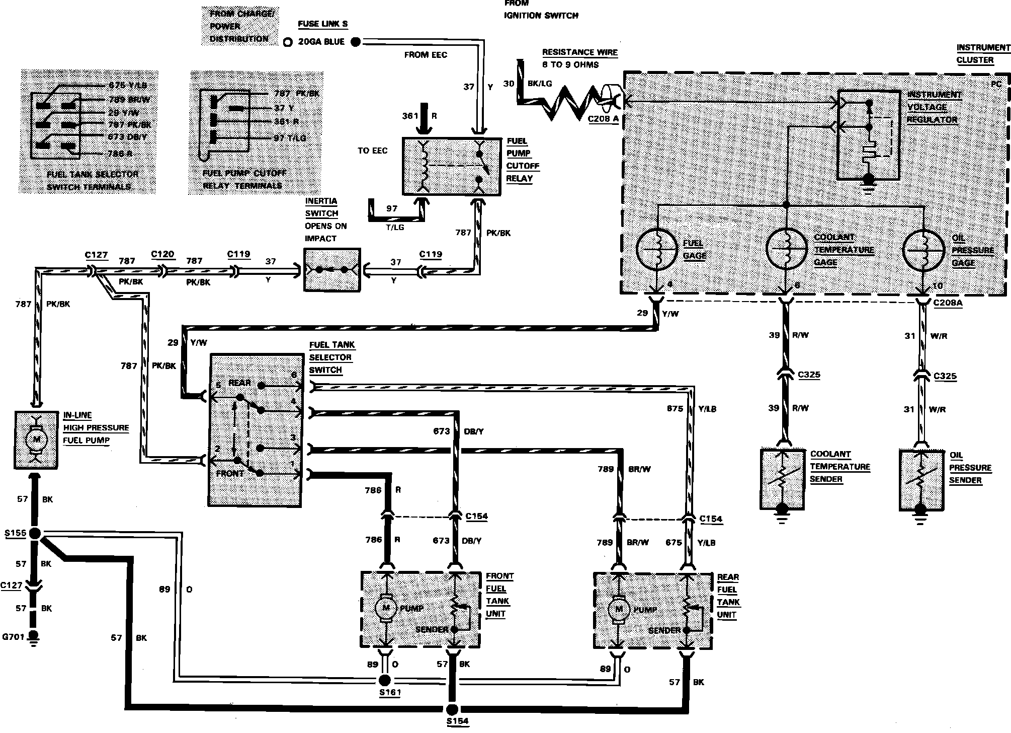 Fig. 16 Electric Fuel Pump Control, Fuel Tank Selector & Gauges Wiring Circuit. F150-350 W/V8-302 (5.0L) EFI Engine & Dual Fuel Tanks:
