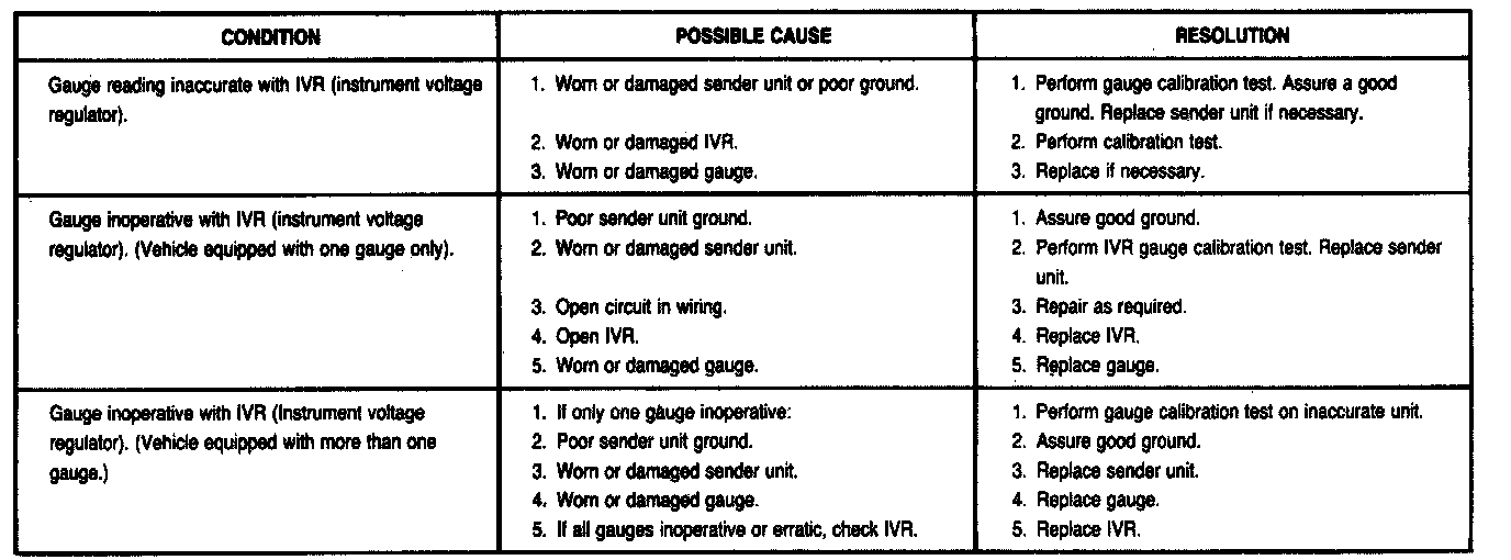 If the gauge pointer does not move and stays below the E mark, check for an open circuit in the wiring assembly, the gauge windings, or the instrument cluster printed circuit. If the gauge pointer moves without any resistor connected, check for a short circuit in the lead to the sender unit. If the gauge reads out of calibration, replace IVR and retest. If still out of calibration, replace the gauge.