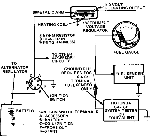 The Rotunda Instrument Gauge System Tester Model 021-00034 or equivalent is used to diagnose problems in all fuel indicating systems using the bimetal fuel indicator gauge and instrument voltage regulator (IVR).
