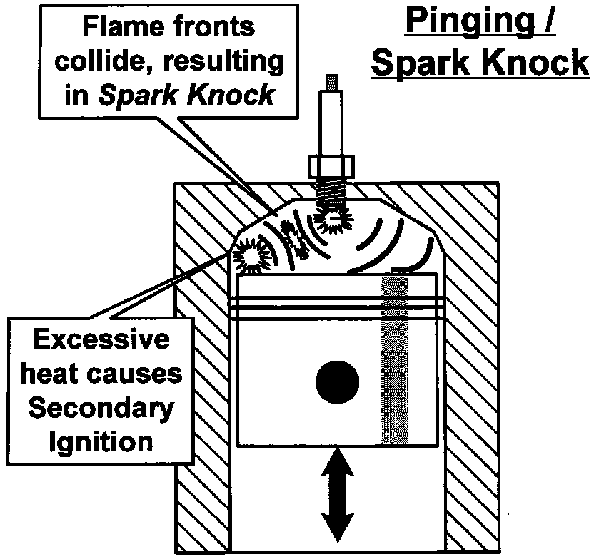 With normal ignition and combustion, the ignition spark ignites the fuel mixture and the combustion spreads evenly across the cylinder. When spark knock occurs, excessive heat and pressure or heated carbon particles ignite the fuel mixture concurrently with the ignition spark, resulting in two separate combustions within the cylinder. The two flame fronts collide, resulting in spark knock or pinging.