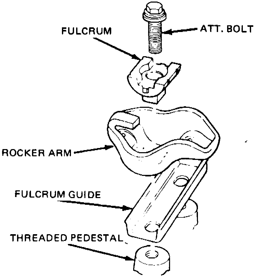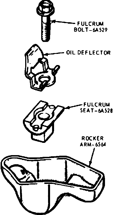 The rocker arm is supported by a fulcrum bolt which fits through the fulcrum seat and threads into the cylinder head. To disassemble, remove the bolt, oil deflector, fulcrum seat and rocker arm, Figs. 26 and 27. 1981-82 models equipped with V8-255, 302 and 351W engines with low profile rocker arm fulcrums (part No. E1TZ-6A528-A) may experience excessive oil displacement when engine is operated for extended periods during high ambient temperatures. This problem may be corrected by replacing original rocker arm fulcrums with part No. D7AZ-6A528-A.
