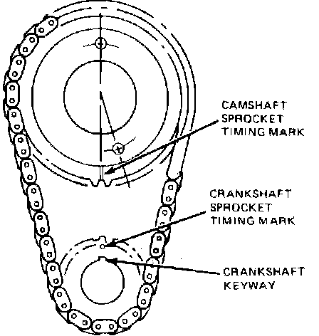 After removing the cover as outlined previously, remove the crankshaft front oil slinger, if equipped. On V6-232 engines, remove camshaft thrust button and spring from end of camshaft. Crank the engine until the timing marks are aligned as shown in Figs. 31 and 32. Remove camshaft sprocket retaining bolt, washer and fuel pump eccentric. Slide sprockets and chain forward and remove them as an assembly. Reverse the order of the foregoing procedure to install the chain and sprockets, being sure the timing marks are properly aligned.