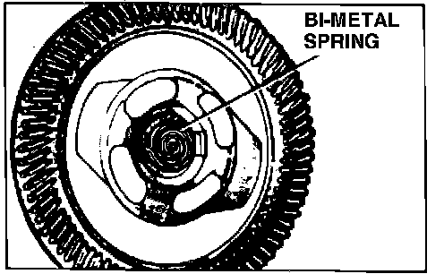 The type of fan drive clutch used, is the coiled bimetallic thermostatic spring type, Fig. 2. The fan drive clutch uses a heat-sensitive, coiled bimetallic spring connected to an opening plate. This units causes the fan speed to increase with a rise in temperature and to decrease as temperature decreases.