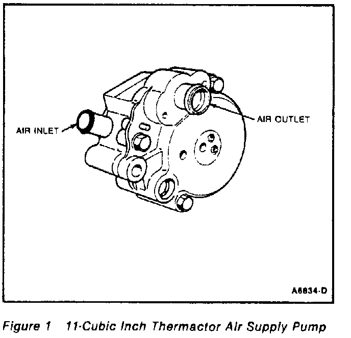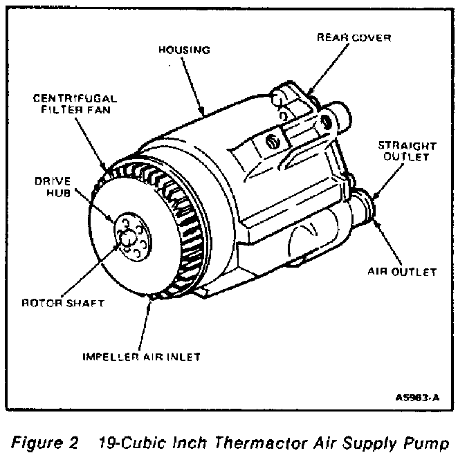 The Air Supply Pump is a belt driven, positive displacement, vane type pump that provides air for the thermactor system It is available in 19-cubic inch and 23-cubic inch sizes, either of which may be driven with different pulley ratios for different applications. Both pumps (Figure 3), receive air from a remote silencer filter attached to the pumps' air inlet nipple. The pressure relief function is performed by the bypass valve.