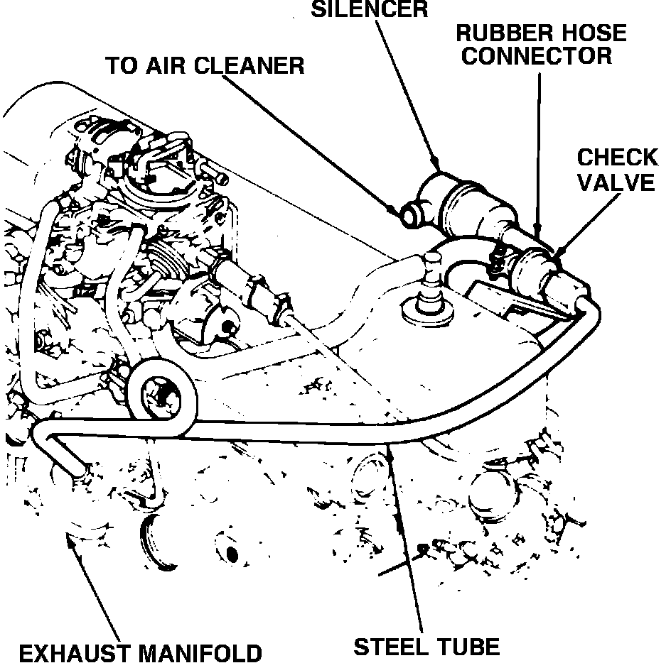 Some engines are equipped with this type of exhaust air injection system, Fig. 79, which does not have an air pump. The system uses the natural pulses of the exhaust system to draw air into the exhaust manifold. The system is regulated by a pulse air valve. The valve, Fig. 80, is connected to the air cleaner with a hose and to the exhaust manifold with a metal tube. Some pulse air valves closely resemble the standard Thermactor check valves, but are not interchangeable with them.