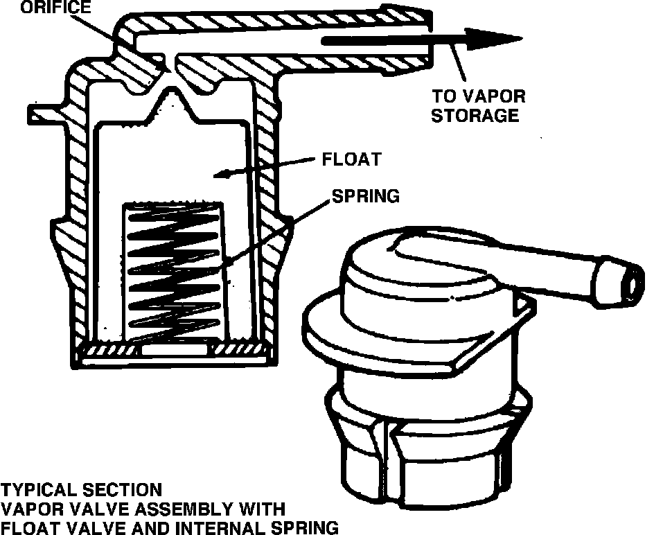 All fuel tank vapor valves, Fig. 55, use a small orifice which allows only vapor and not fuel to pass into the line going to the vapor storage canister. This assembly is mounted on the fuel tank. Fuel vapors trapped in the sealed fuel tank are vented through the vapor valve assembly. The vapors leave the valve assembly through a single vapor line and continue to the charcoal canister for storage, until they are purged into the engine. On vehicles equipped with fuel/vapor return lines, vapors created in the fuel line is continuously vented back to the fuel tank. This prevents engine surging from fuel enrichment.