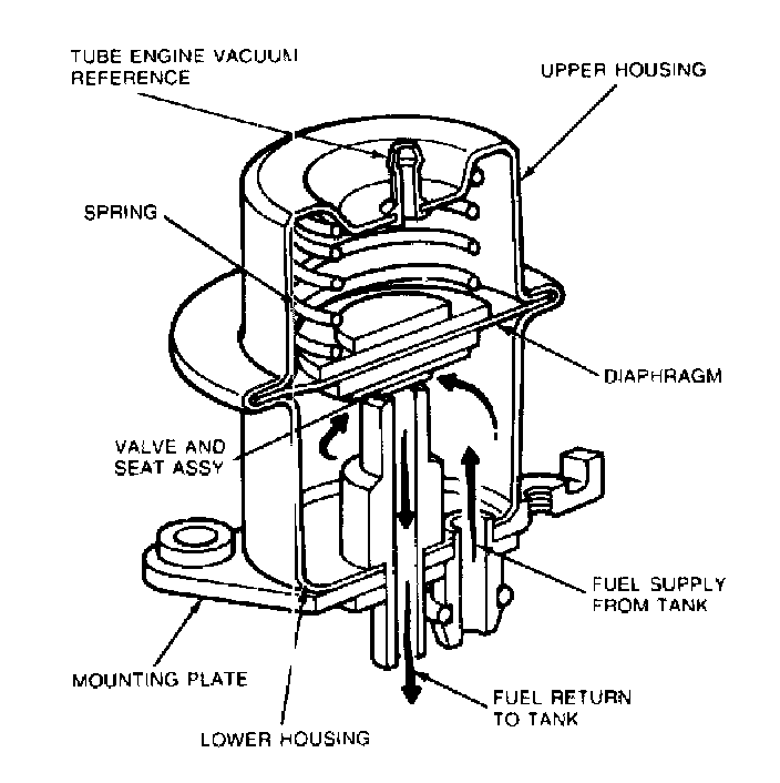 The regulator is a diaphragm-operated relief valve in which one side of the diaphragm is exposed to fuel pressure and the other side is subjected to intake manifold pressure for multi-point fuel injection (EFI) and atmospheric pressure for single point injection (CFI).