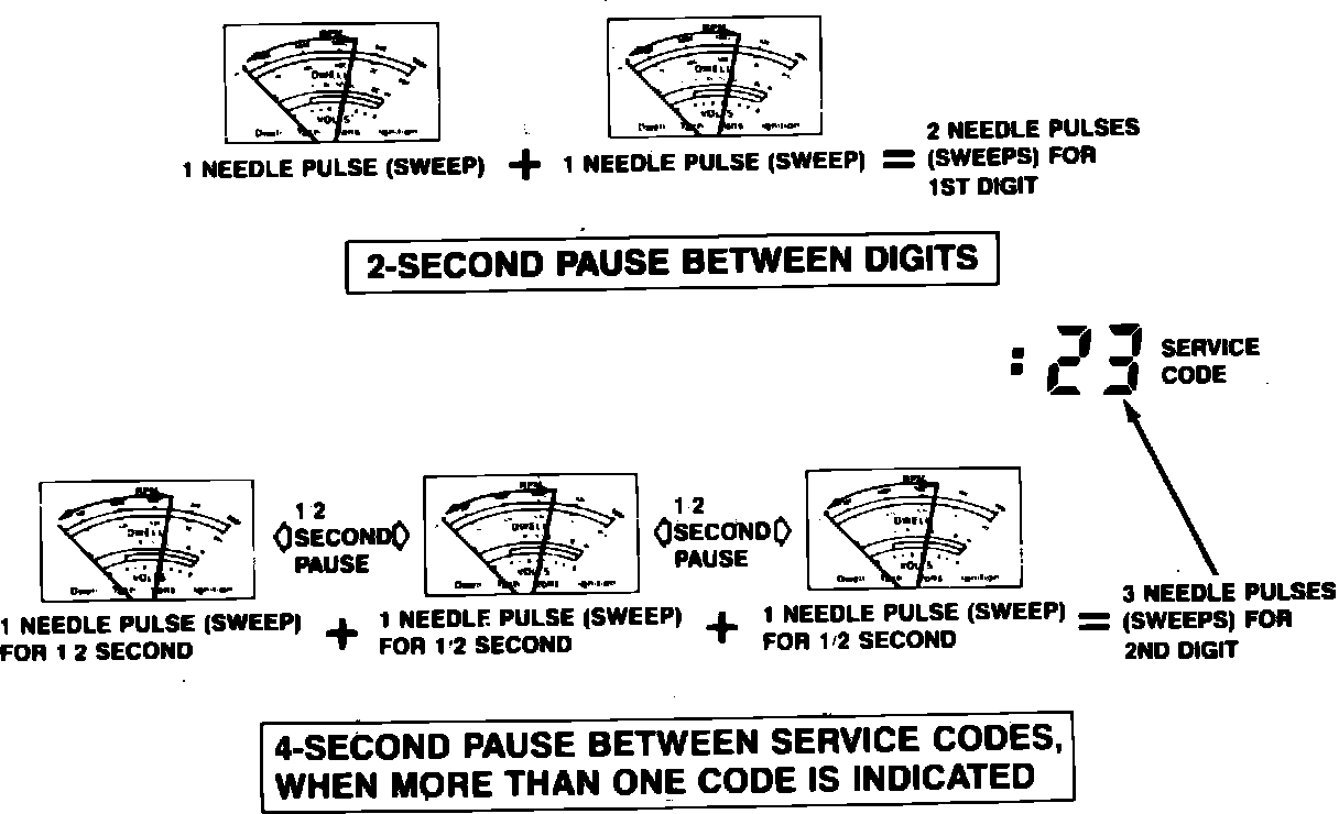 d. Finally the voltmeter needle will sweep twice (with a two second pause in between the sweeps) representing another code 11. After four seconds this code will be repeated.