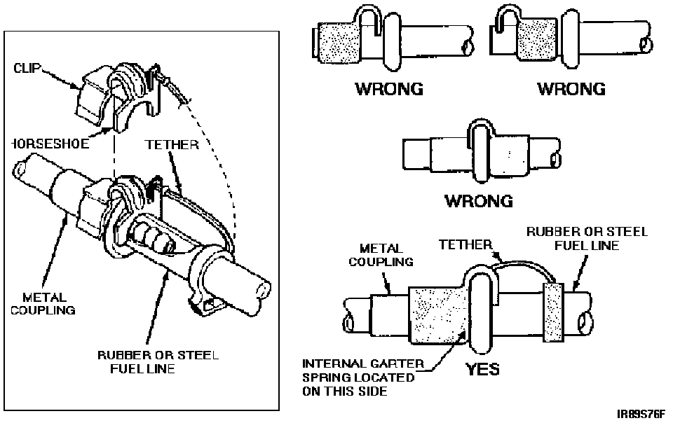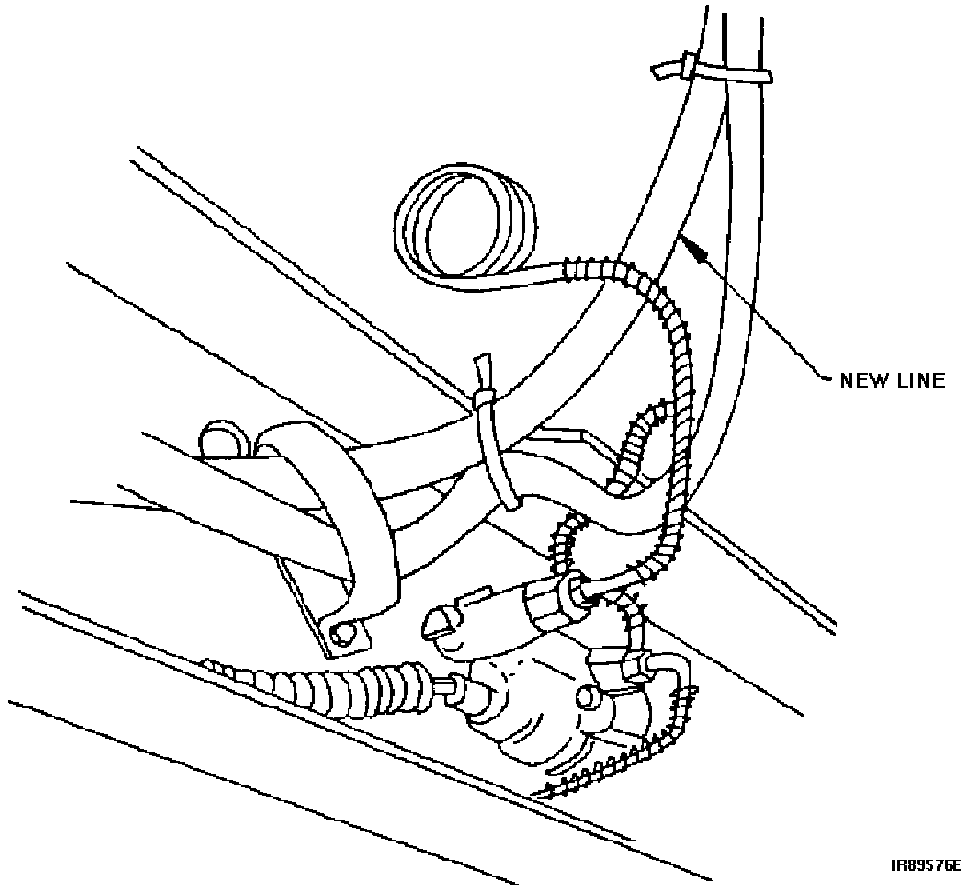 13. (5.8L or 7.5L) Strap new fuel line to existing fuel line insulation bundle as shown in Figure 1. Locate tie straps 95874-S at 8" (20 cm) intervals. Ensure heat shield is installed as shown in Figure 1. Use additional strap to secure fuel line to shield. Cut off excess tie strap length. Slight excess fuel line length is allowed to form a "hump" at the upper end of the fuel line near the engine.