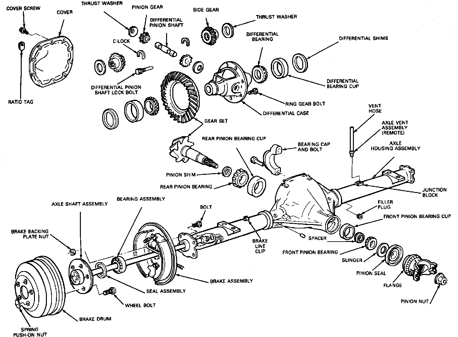 Fig. 3 Exploded view of 8.8 & 10.25 inch ring gear axles (except models w/anti-lock brakes). 8.8 inch ring gear axle shown, 10.25 inch ring gear axle similar: