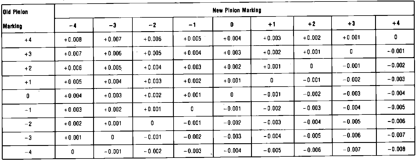 If a new gear set is being used, notice the (+) or ( - ) etching on both the new and old pinion and adjust thickness of new shim pack to compensate for the difference of these two figures. For example, if the old pinion reads +2 and the new pinion is - 2, add .004 inch shims to the original shim pack.