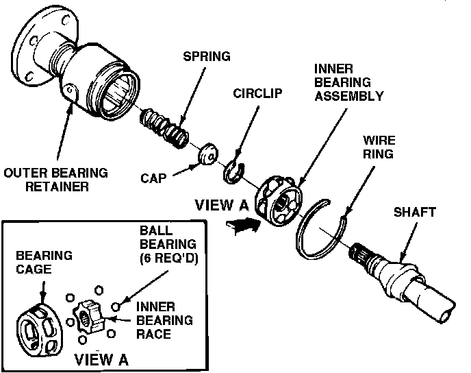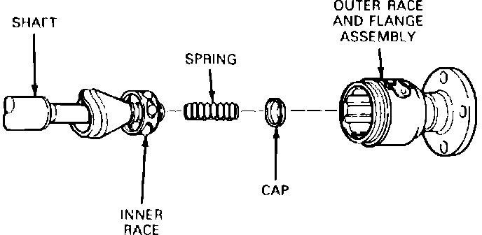 The CV type joint, Fig. 10, incorporates an outer bearing retainer and flange, spring, cap, circlip, inner bearing assembly and a wire ring. The inner bearing assembly incorporates a bearing cage, six ball bearings and an inner race.