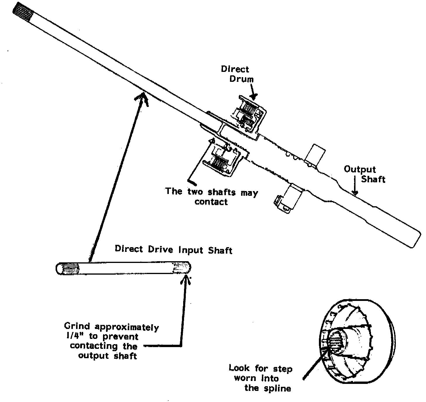 If a step is found in the direct drum spline, grind approximately 1/4" off the direct drive input shaft spline.