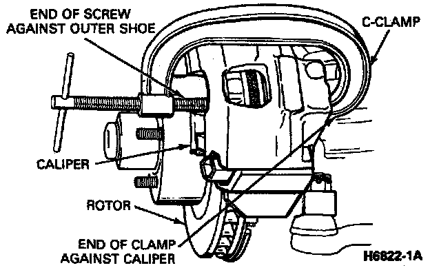 3. Install an eight inch C-clamp on caliper. Tighten clamp to bottom caliper piston in cylinder bore. Remove the clamp.