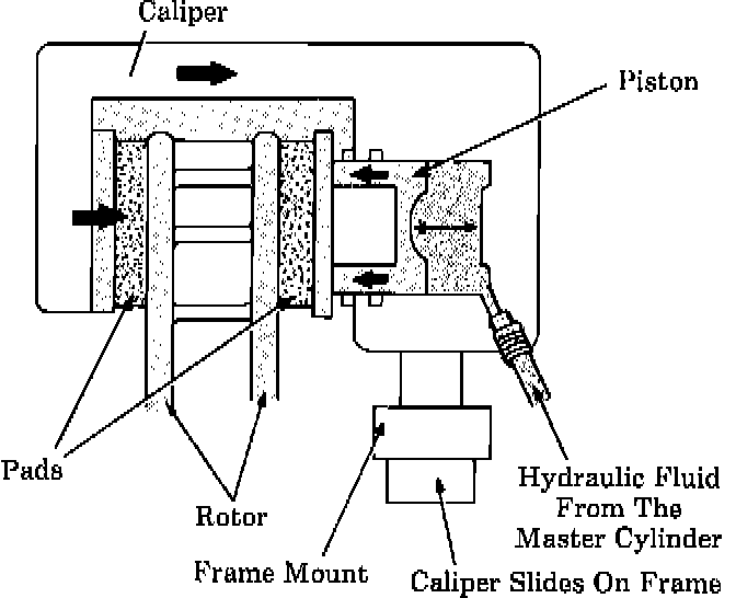 NOTE: Floating calipers require free and unrestricted movement on the caliper mounting. Floating or sliding calipers have pistons only on one side of the rotor. The first part of the piston's travel forces the inner pad against the rotor, then further travel forces the movable part of the caliper to pull the outer pad against the rotor.