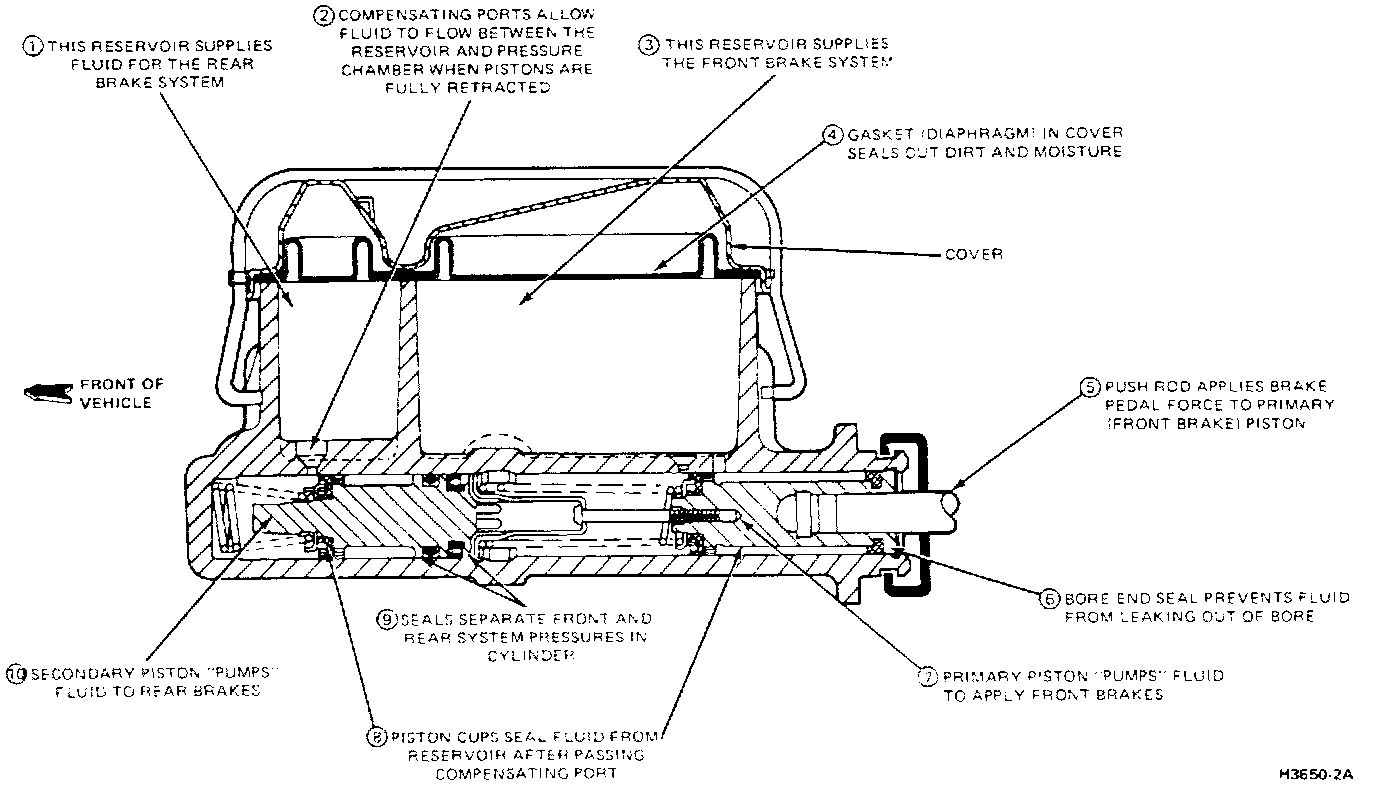 Front wheel brakes - are connected to the primary outlet port (nearest the dash panel) and are actuated by the primary piston assembly.