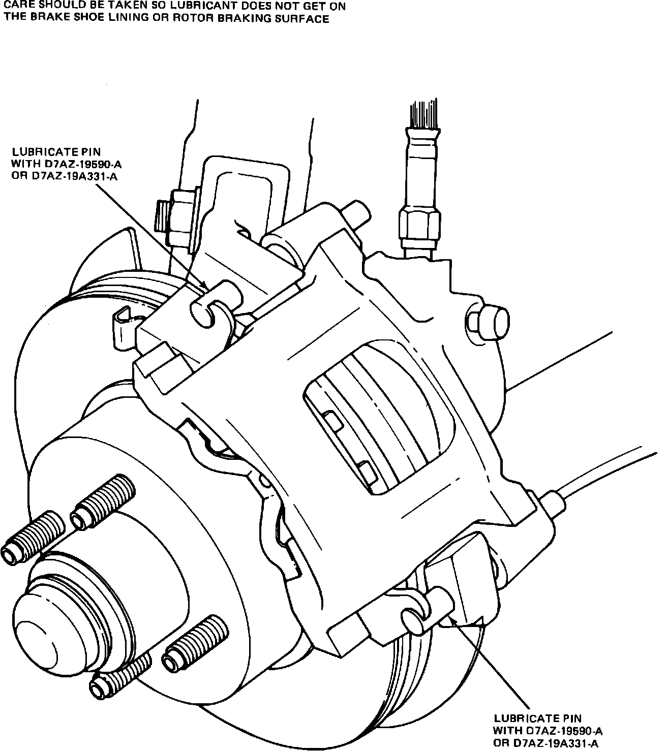 5. Remove the two caliper locating pins and lubricate with D7AZ-19590-A or D7AZ-19A331-A on the pin surface where the outer brake shoe slides (Figure 14). Care should be taken so that the lubricant does not get on the brake linings, the rotor braking surface, or the pin threads.