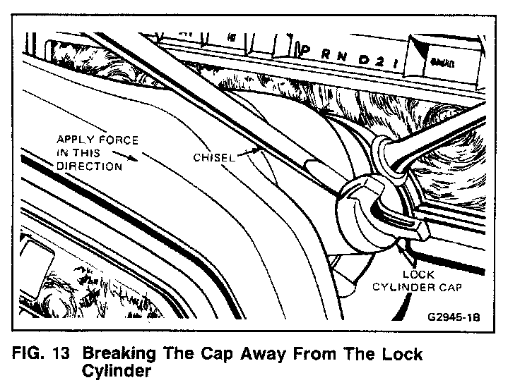 5. Tilt the steering column to the full down position. Place a chisel at the base of the ignition lock cylinder cap, and, using a hammer, strike the chisel with sharp blows to break the cap away from the lock cylinder.