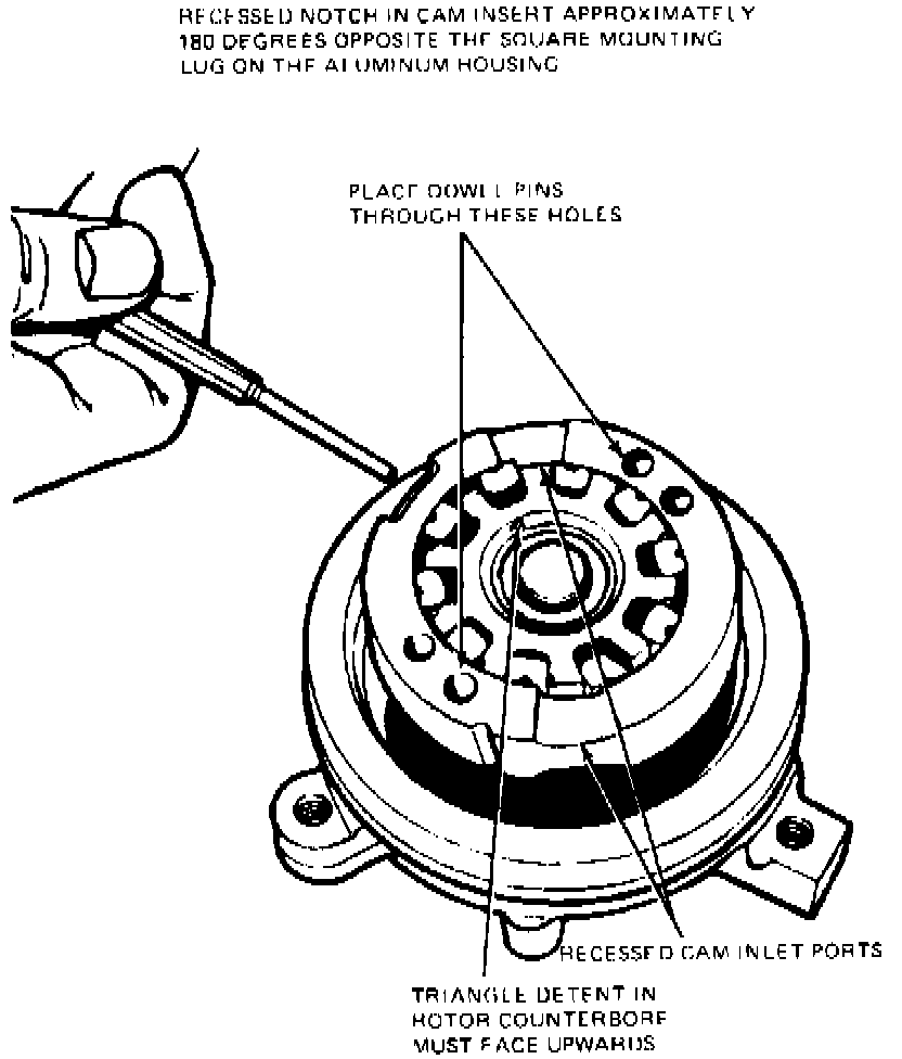 13. Install cam, rotor, rotor and slippers and rotor shaft assembly into pump housing over dowel pins. When installing assembly into pump housing,stepped holes must be used for dowel pins and notch in cam insert must be toward reservoir and approximately 180 degrees opposite square mounting lug on housing, Fig. 6.