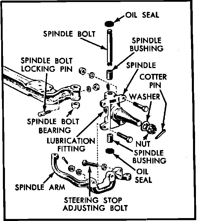 Each spindle is held in place on the axle by ball joints or a spindle bolt which pivots in bushings pressed in the upper and lower ends of the spindle, Fig. 2. On models equipped with spindle bolts, a thrust bearing is installed between the lower end of the axle and the spindle to support the load on the axle. On all models, a spindle arm is installed on each spindle for attachment to the steering linkage.