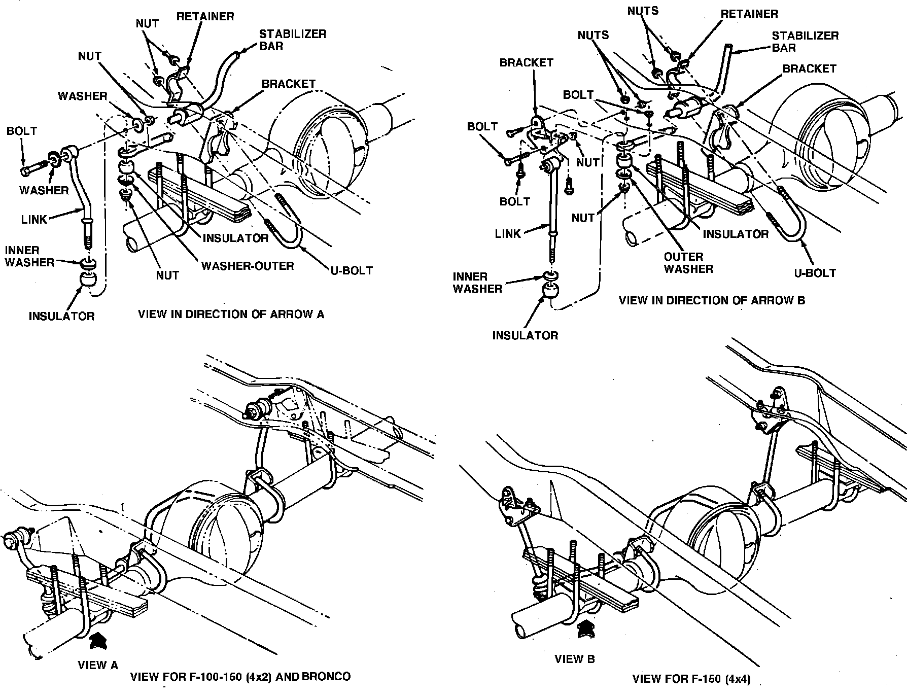 Fig. 6 Stabilizer bar replacement. 1981---87 F-100---150 & Bronco: