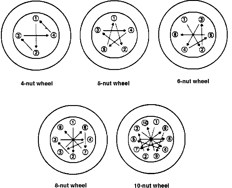 Tighten the fasteners a quarter turn at a time using the tightening sequence diagram as a guide. This is very important to prevent misalignment of the wheel. Continue tightening the fasteners in sequence until the fasteners are tightened to the proper torque (See WHEEL FASTENER TORQUE).
