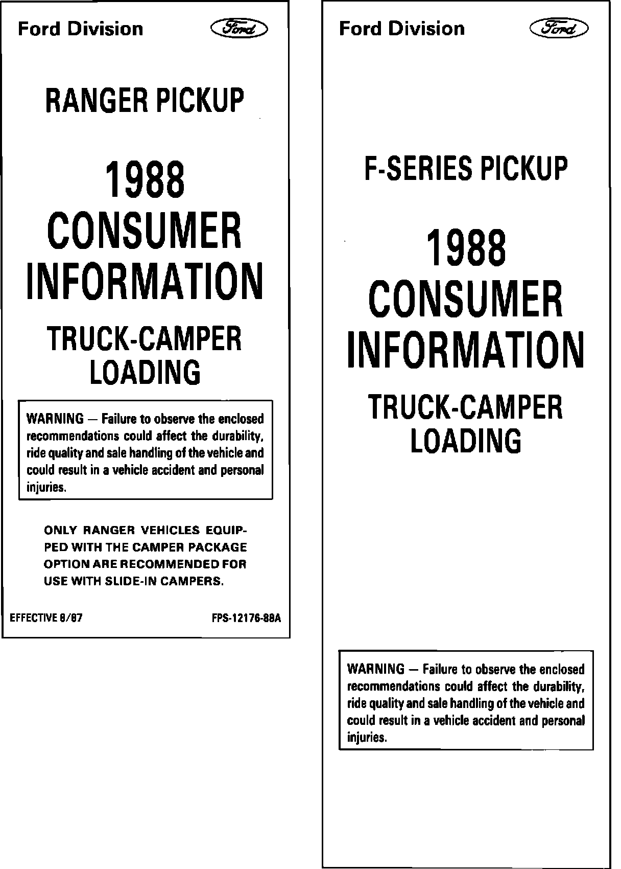 The second method is to calculate the camper carrying capability by using the Truck Camper Consumer Information Booklets available in the sales showroom (Figure 14 shows booklets appearance). Some vehicles are excluded from carrying campers while others may require certain option content. Figures 15 and 16 are excerpts from the information booklet. Size limits must be determined using the tables in the booklets.