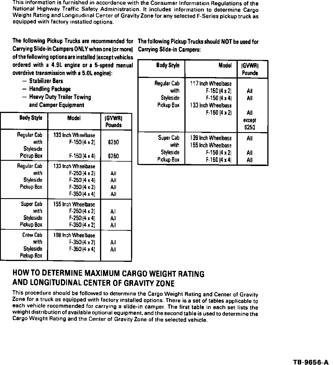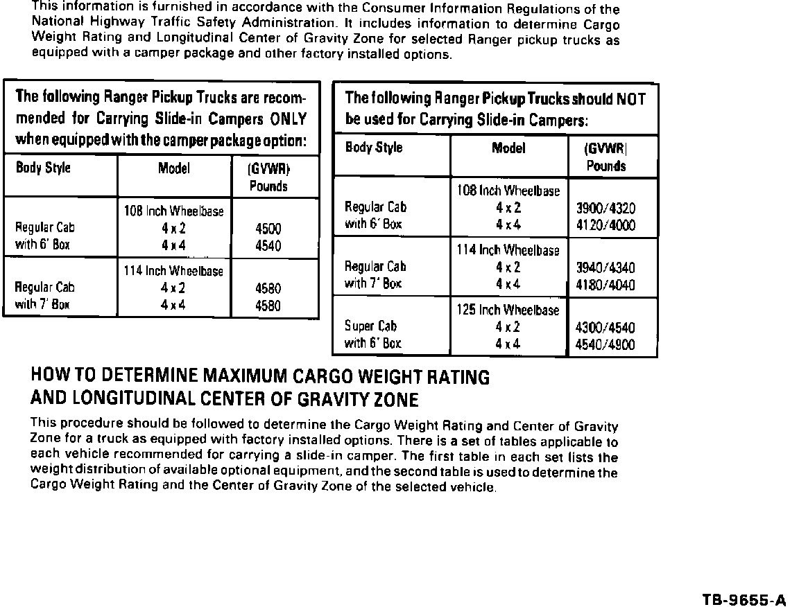 Camper carrying capability can be determined two (2) ways. First, each vehicle is provided with a camper carrying capability statement for that specific vehicle. This sheet gives information showing the vehicle is capable of carrying a camper and notes the weight and center of gravity zone or states that no camper can be carried.