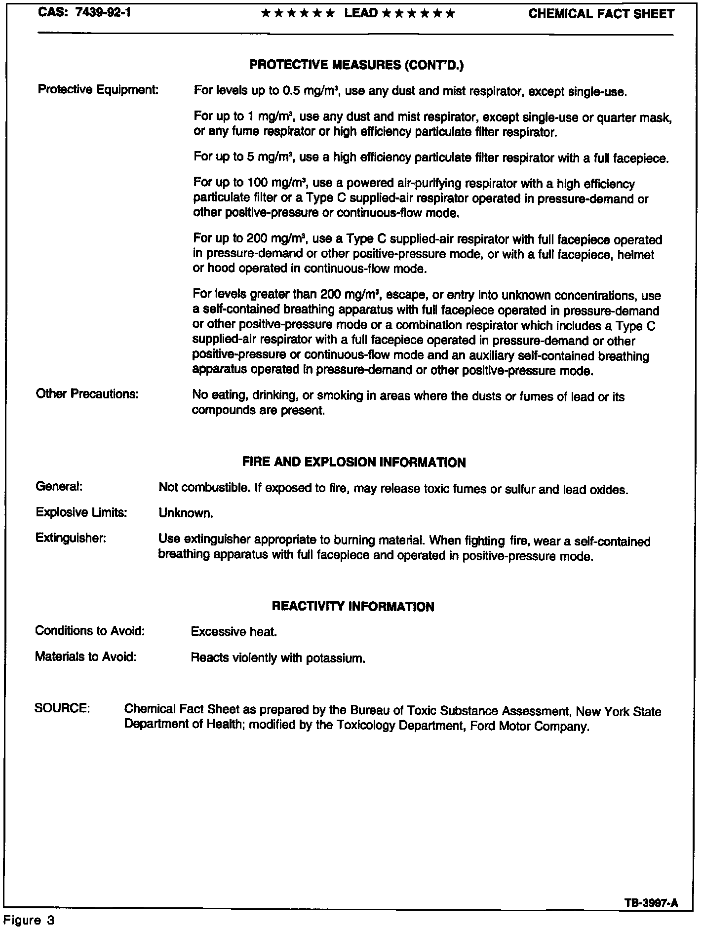 LEAD CONTAMINATION POTENTIAL: THE ELECTRODEPOSITION PRIMER USED BY FORD MOTOR COMPANY OVER BASE METAL ON SERVICE REPLACEMENT PARTS OR COMPLETED VEHICLES CONTAINS SMALL AMOUNTS OF LEAD FOR CORROSION PROTECTION OF STEEL. EXCESSIVE DUSTS GENERATED BY UNNECESSARY AND IMPROPER SANDING MAY CONTAIN AIRBORNE LEAD CONTAMINATION IN EXCESS OF OSHA STANDARDS. INFORMATION REGARDING THE HAZARDS OF LEAD CAN BE FOUND IN THE CHEMICAL FACT SHEETS IN THE FIGURES IN THIS ARTICLE.