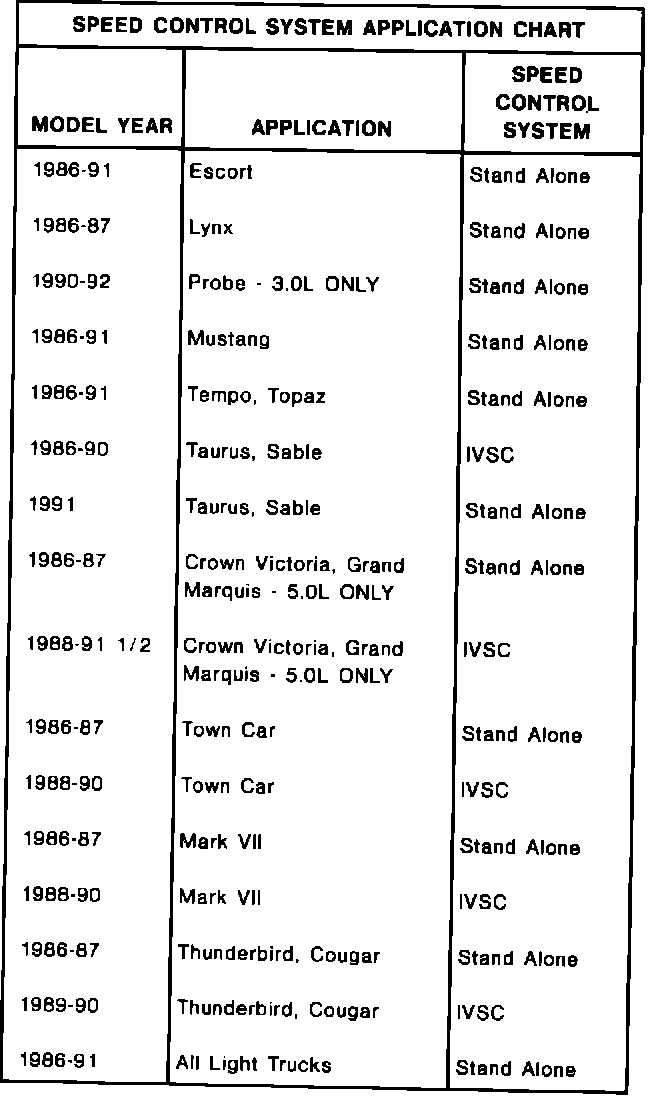 ISSUE: Integrated Vehicle Speed Control (IVSC) was introduced on some 1986 units. The IVSC system uses the EEC IV processor as the control module. Before IVSC a Stand Alone Speed Control System was used on all applications. The Stand Alone Speed Control System uses a separate control amplifier.