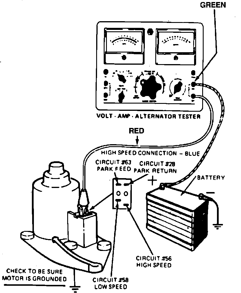 2. Connect multimeter to wiper motor, Fig. 1, connecting positive lead of tester first to low speed connection, then to high speed connections at connector plug. Current draw should not exceed 3 amps.