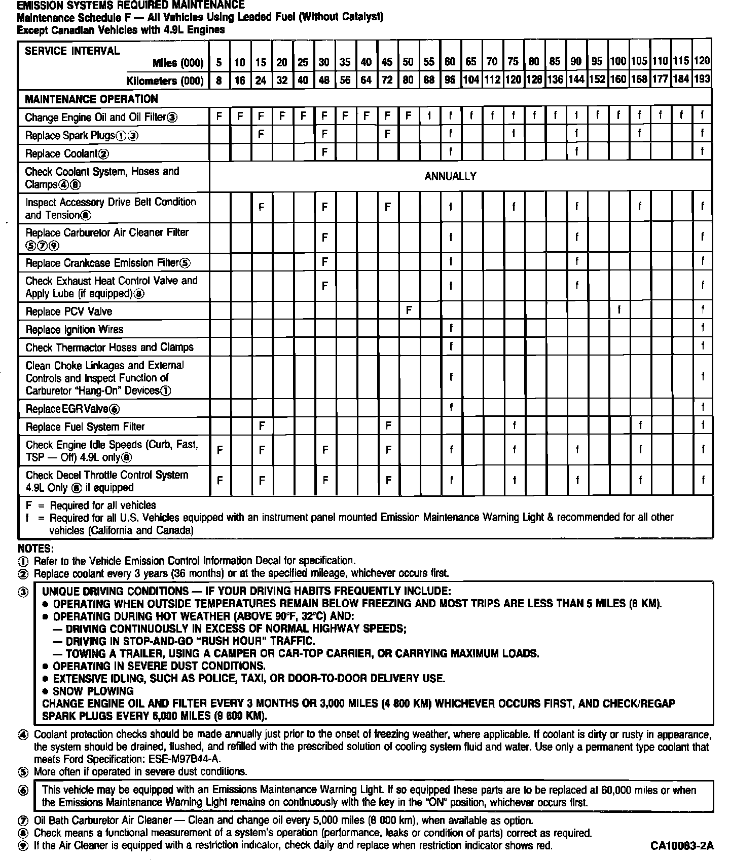 Maintenance Schedule Applicable To Bronco, E-150, E-250, E-350 and F-150, F-250, F-350 Trucks Four maintenance schedules are specified for the 1986 model Bronco, Econoline and F-Series trucks. They are identified by the lefters B, E, F and L. The application of the various maintenance schedules are as follows: