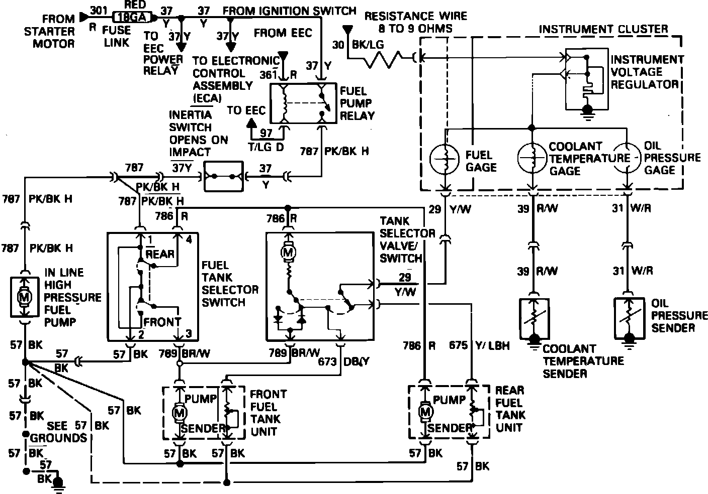 Fig. 8 Fuel pump wiring diagram. 1985-87 4-140 EFI & V8-302, 1986-87 V6-177 & 1987 6-300 w/dual tanks:
