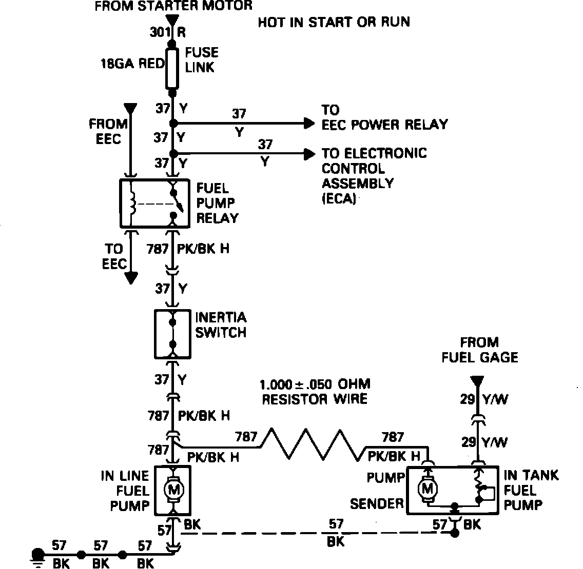 Fig. 7 Fuel pump wiring diagram. 1985 - 87 4-140 EFI except Aerostar & V8-302, Early 1986 Aerostar 4-140 EFI, 1986-87 V6-177 & 1987 6-300 models w/single fuel tanks: