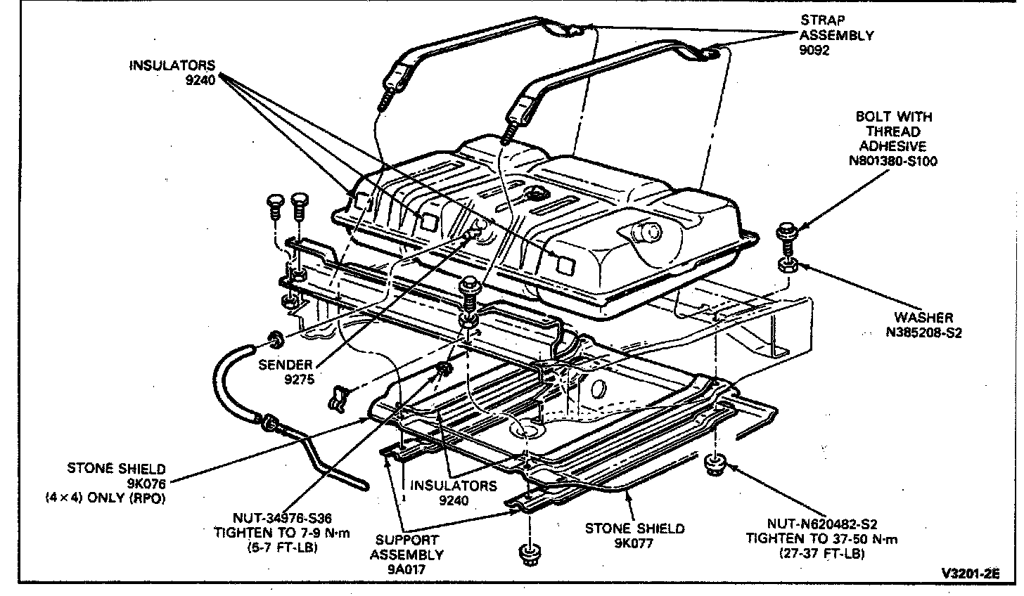 5. Position the tank assembly against the top straps or the frame and install the attaching bolts and nuts using thread adhesive (such as "Loctite"). Tighten the attaching bolts and nuts to 37-50 N m (27-37 ft- lbs).